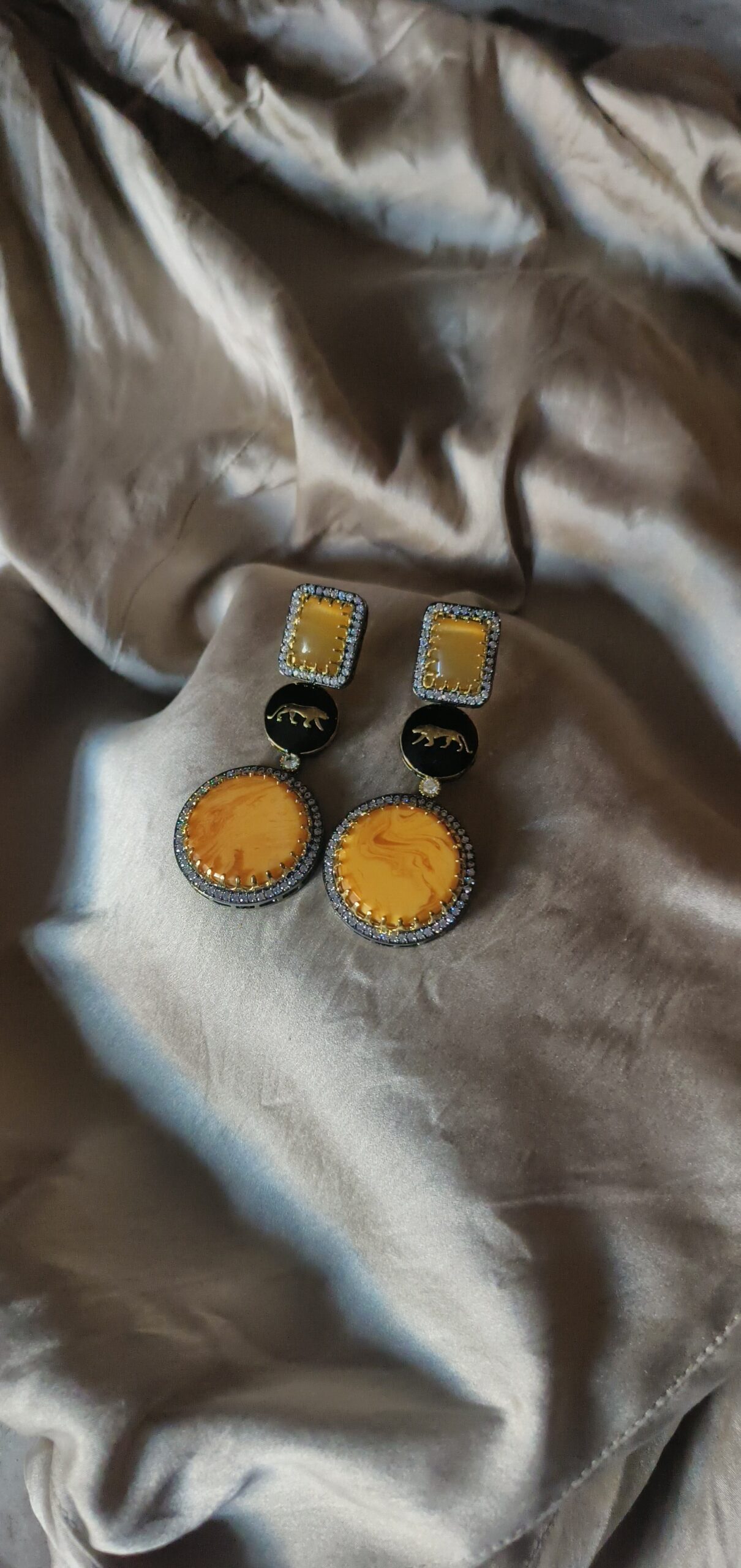 Bhorr Earrings are a breathtaking tribute to heritage and dawn-inspired radiance, seamlessly blending the iconic Sabyasachi aesthetic with contemporary brilliance. Drenched in a rich, sun-kissed yellow—evocative of the first light of morning—these earrings feature the prestigious Sabyasachi “Bengal Tiger” logo, meticulously embossed as a mark of unparalleled luxury and artisanal pride. The vibrant gold-toned base is elevated by strategically placed diamond details that add a rhythmic sparkle, mimicking dewdrops catching the sun. Bold yet intricately detailed, the Bhorr earrings are more than just jewelry; they are a wearable piece of art that bridges the gap between traditional Indian soul and modern, high-fashion glamour