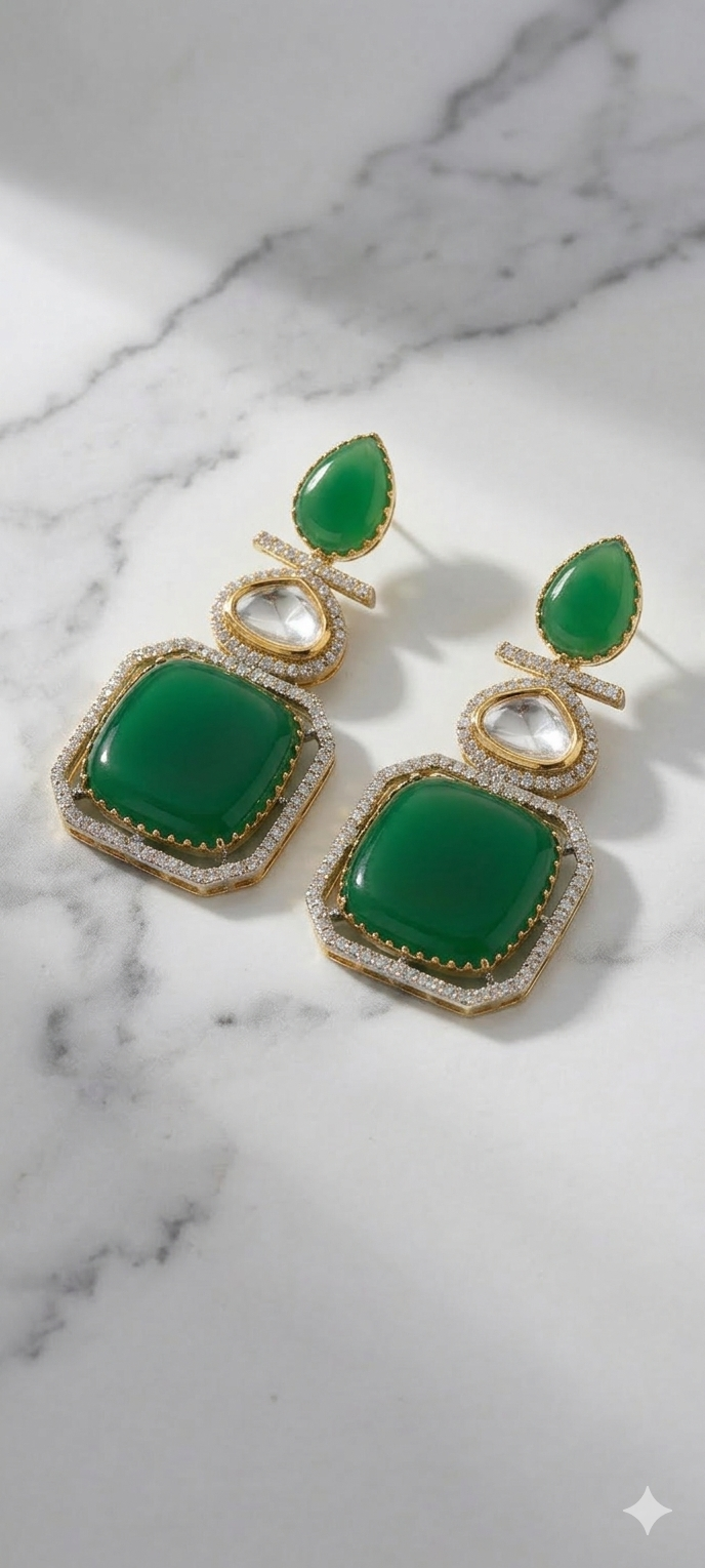 Green Square Nano-Setting Earrings are a masterclass in geometric precision and high-definition brilliance. Centered around a vivid, verdant green stone, these earrings utilize the cutting-edge nano-setting technique, where microscopic diamonds are placed with such density that they create a seamless, shimmering “crust” of light. The sharp, architectural square silhouette provides a modern, clean-lined frame that anchors the intensity of the emerald-toned center. This isn’t just a piece of jewelry; it’s a sculptural statement where the organic depth of the green meets the clinical perfection of the diamond work, resulting in a look that is both grounded and electrifyingly luxurious