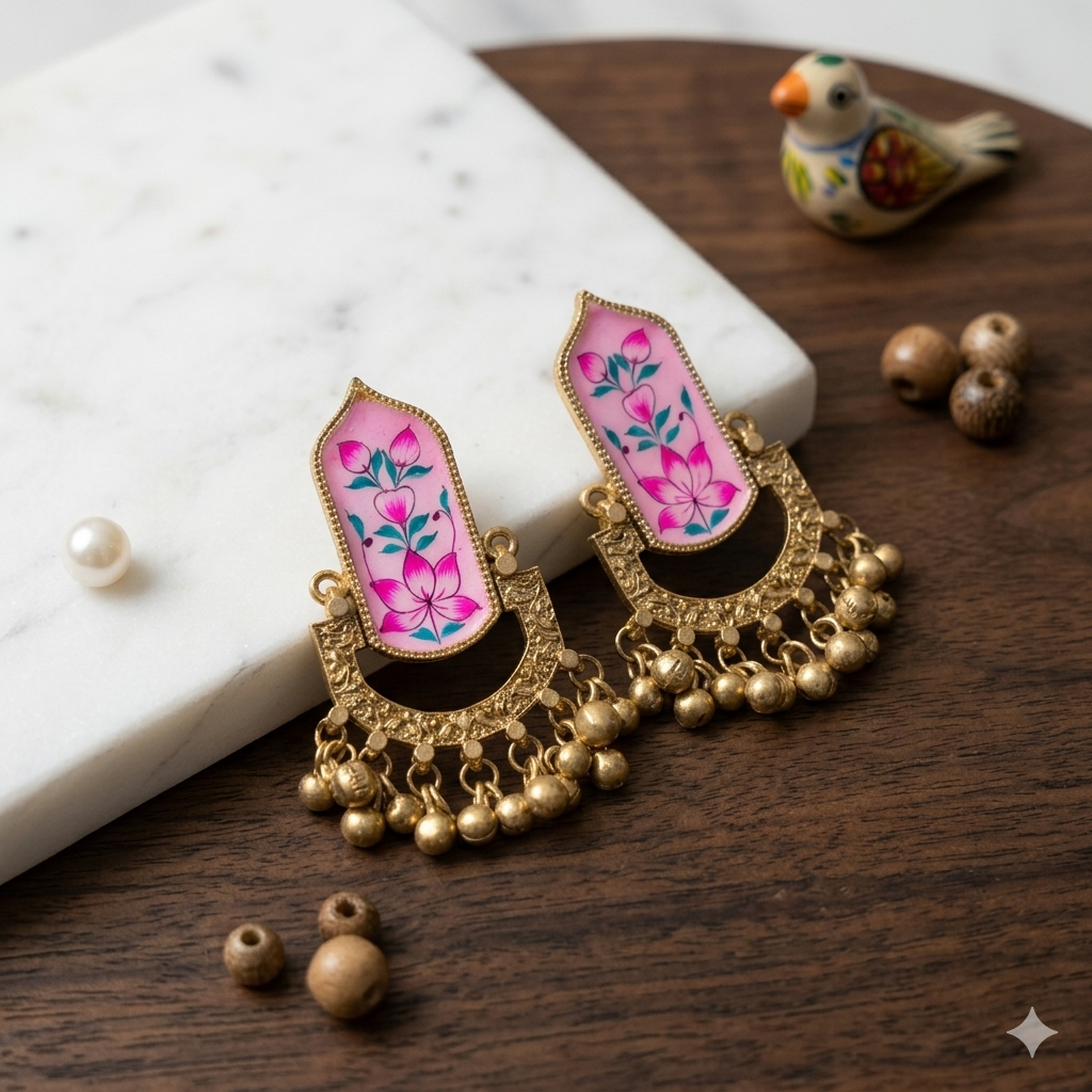 Ghungroo Kalamkari Design Earrings are a poetic fusion of two legendary Indian art forms, weaving together the “pen-crafted” storytelling of Andhra Pradesh with the rhythmic charm of traditional dance. At the heart of each earring lies a hand-painted or meticulously etched Kalamkari motif—featuring the iconic life-tree, celestial deities, or sprawling vine patterns—rendered in earthy, organic tones like madder red, indigo, and mustard. This narrative centerpiece is anchored by a cascading fringe of tiny metallic ghungroos, which provide a soft, melodic chime with every tilt of the head. These earrings are more than just jewelry; they are a wearable tapestry, celebrating the rustic soul of the artisan and the elegant motion of the dancer
